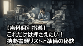 未分類 【歯科個別指導】これだけは押さえたい!持参書類リストと準備の秘訣 歯科個別指導で求められる膨大な書類に戸惑っていませんか?この記事では、個別指導で持参を求められる書類の全リストを公開。書類審査を乗り切るための準備の重要性と、日頃からの整備・保管のポイントを解説します。 2025.10.06 未分類